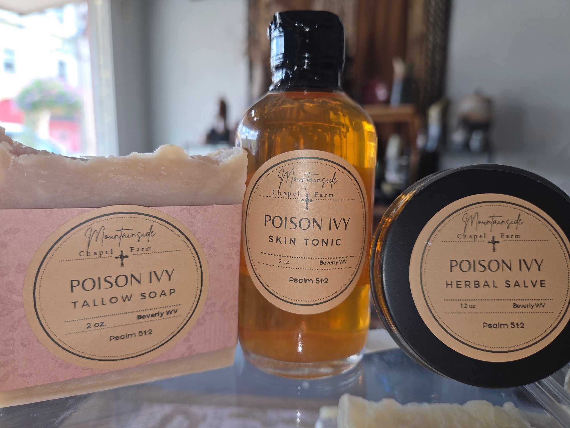 Jewelweed Salve: Made from jewelweed infused olive oil, local beeswax, and essential oils. Apply this to a poison ivy rash after washing and applying the skin tonic. This will help nourish the skin, reduce the inflammation caused by the rash, and reduces itch. 1 oz. $8